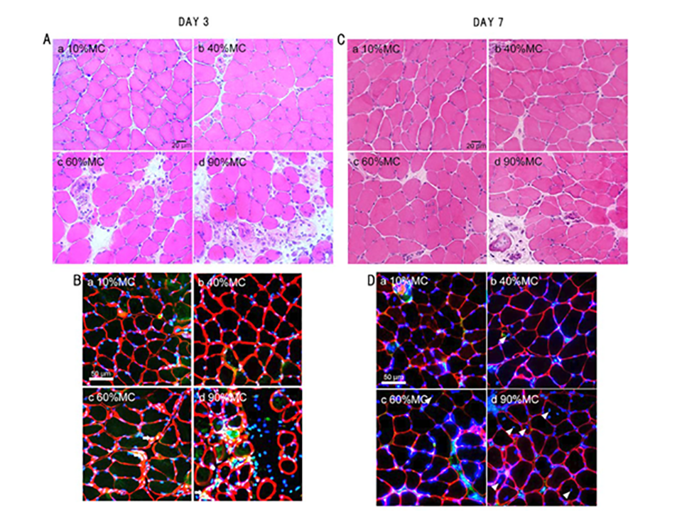 【図】 マウス萎縮筋に対して強度を変えたトレーニングを実施した際の回復を比較しました。最大筋力の40%の負荷運動を行うと,1週間でもとのサイズ,元の筋力と同程度まで回復することを明らかにしました。一方,正常筋に対して筋強効果があるといわれる高強度のトレーニングを行うと,むしろ筋損傷が激しく,回復が遅れることが明らかになりました。 (Ito, Muscle Nerve 2017