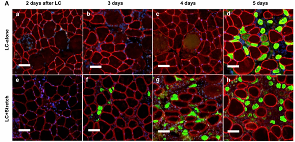 【図】ラットの損傷筋に対して,損傷1日後に5秒間の軽いストレッチングを繰り返し15分間行うと,再生筋線維(緑色の部分)の発現が早く表れ,筋力の回復も早く得られることを明らかにしました。