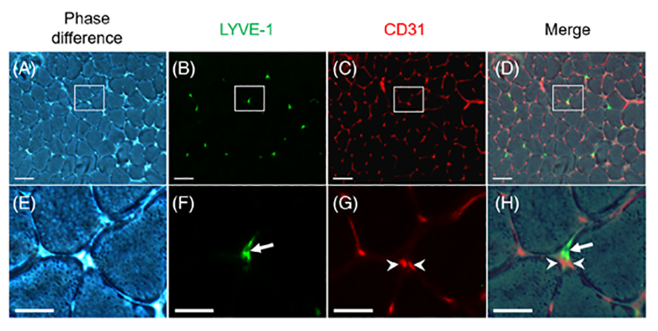 【下図】リンパ管(矢印,緑)は,筋線維と筋線維との間に毛細血管(矢じり,赤)に隣接して,筋内全域に分布していることがわかりました。このリンパ管は,筋萎縮急速に起こる器官に重要な役割を担うことを示唆することを明らかにしました。